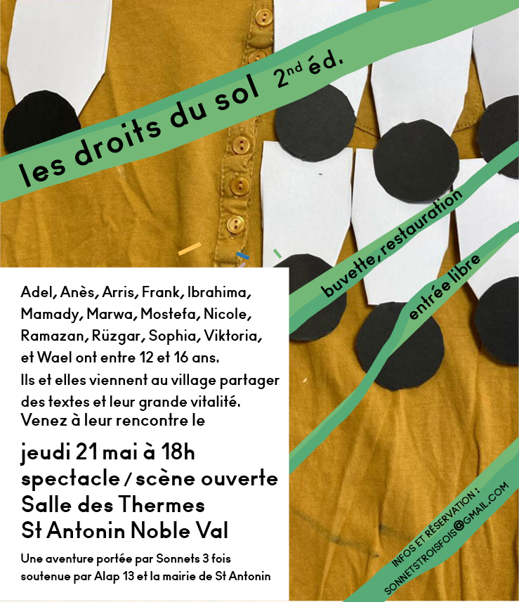 Depuis novembre, j’interviens dans la classe de FLE du collège d’Aucamville (31). Je suis toujours impactées par les moments d’explorations autour du langage, de la mise en jeu des corps et des représentations que nous partageons. Ces adolescentEs – absolument extras – viendront à St Antonin Noble Val le jeudi 21 mai à 18h partager le spectacle poétique vers lequel nous cheminons. Ce sera suivi d’une scène ouverte poésie, slam, philosophie…